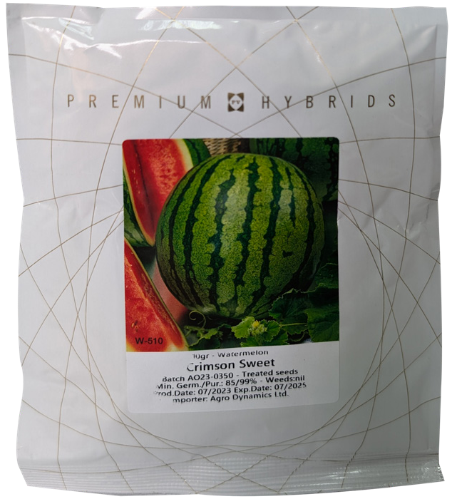 Watermelon Crimson Sweet. A very productive variety producing large round melons averaging 20-25 lbs which are oval, light green with dark green stripes. The fruit has very sweet flesh that is brilliant red and practically seedless. Good disease resistance. Ready for harvest about 85 days after seeding in warm conditions. Can be grown outside in a warm, sheltered and sunny location, but for the most reliable crops under glass is best.