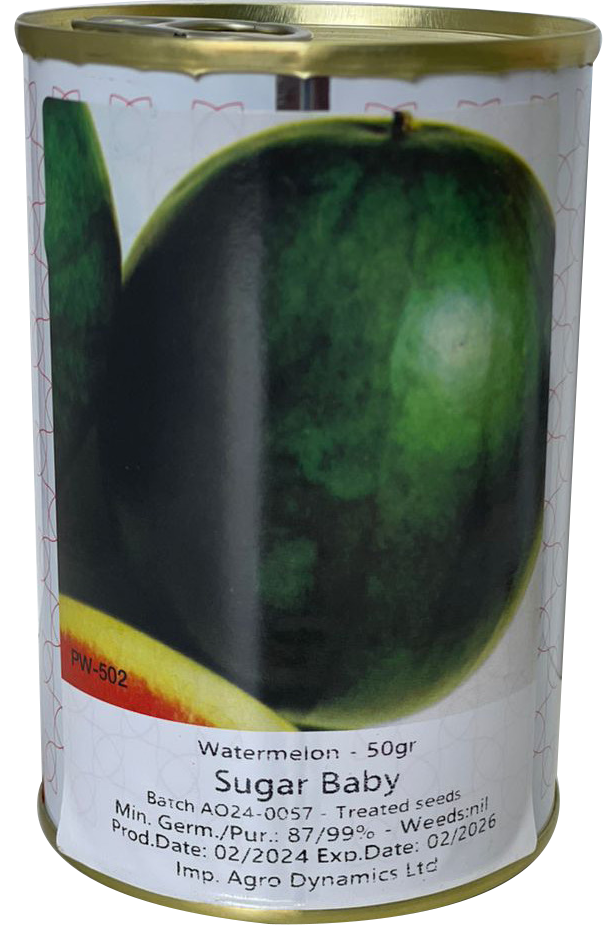 Water Melon Sugar Baby. Sweet tasting and smaller fruited “Ice Box” type watermelon. Early and very productive with sweet, juicy, fine- textured, medium-red flesh and thin hard rind. The round, 8 to 12 lb, dark green skinned melons grow 8 inches across. Ideal variety if space is limited, as this can be trailed on trellises and faster to ripen in short summers. Drought Resistant. Ready to harvest about 75 days after seeding in favourable conditions. Can be grown outside in a warm, sheltered and sunny location, but for the most reliable crops under glass is best.